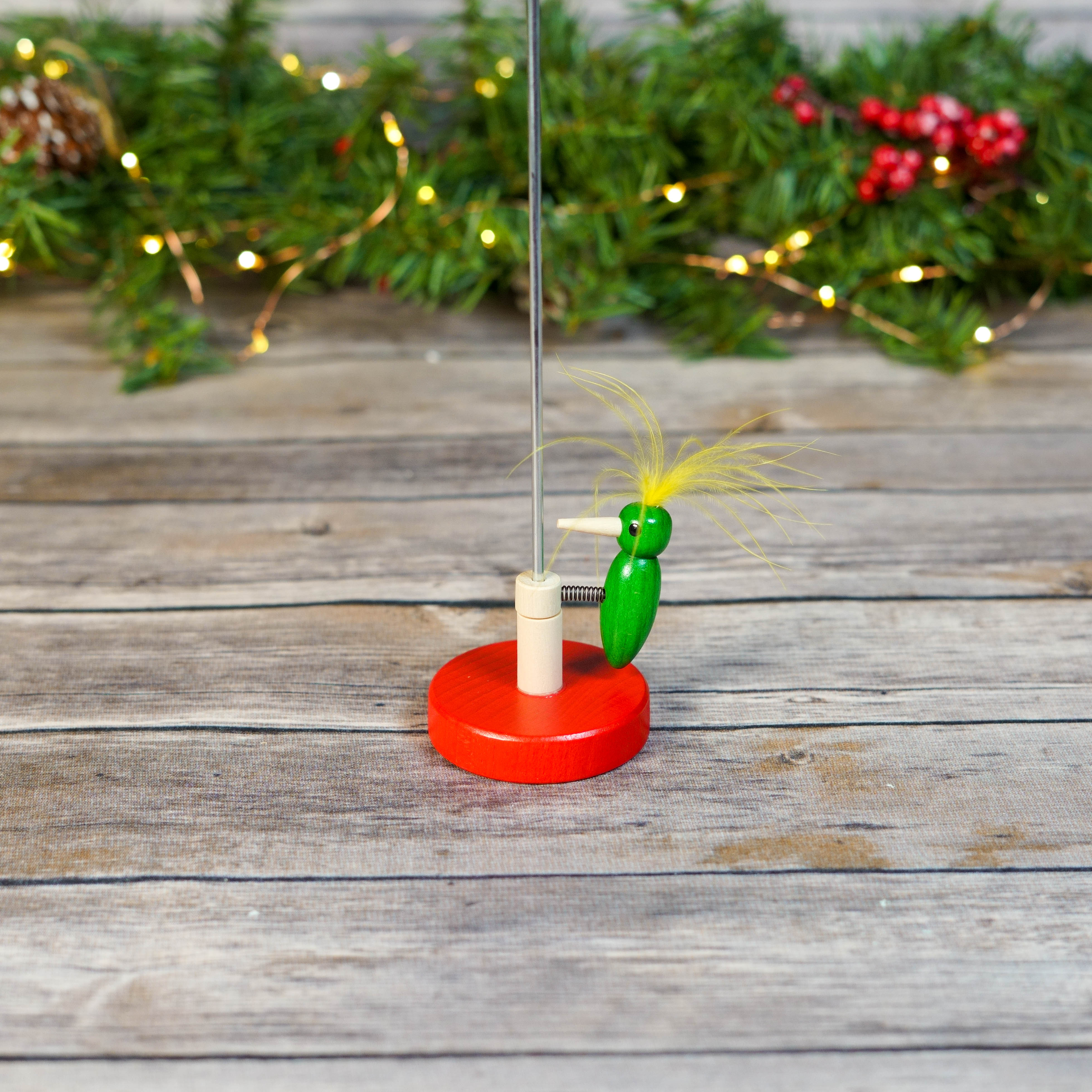When the woodpecker is pulled up the metal rod to the wooden ball and then released, it pecks and hammers with its beak, sliding down to the base plate.