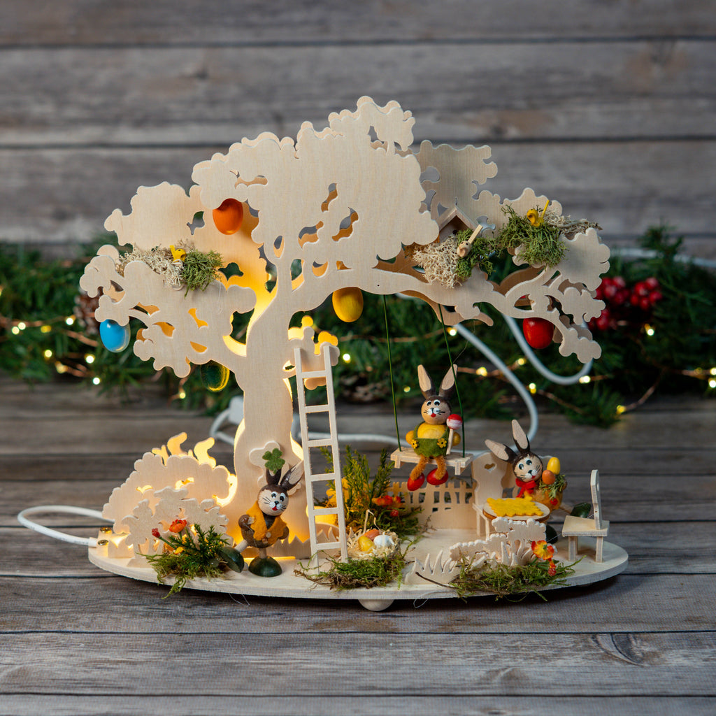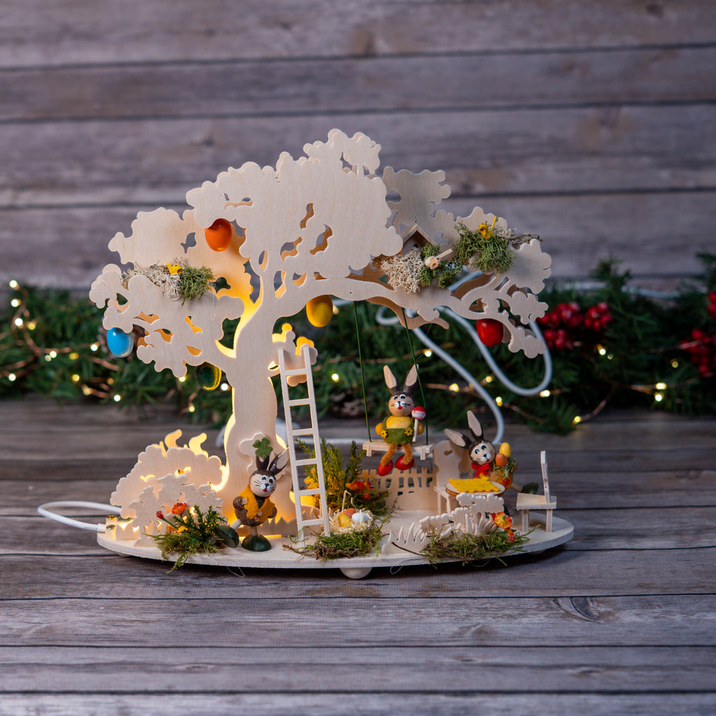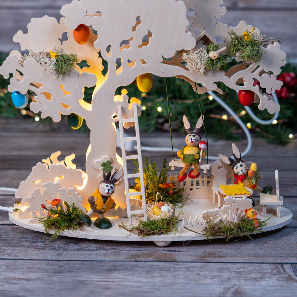 A beautiful Easter tree with LED lights in colorful balloons. A bunny swings while a wobbly bunny prepares a picnic at a seating area, and another is already busy hiding Easter eggs. Three bird's nests, Easter eggs, and floral Easter elements complete this Easter scene.