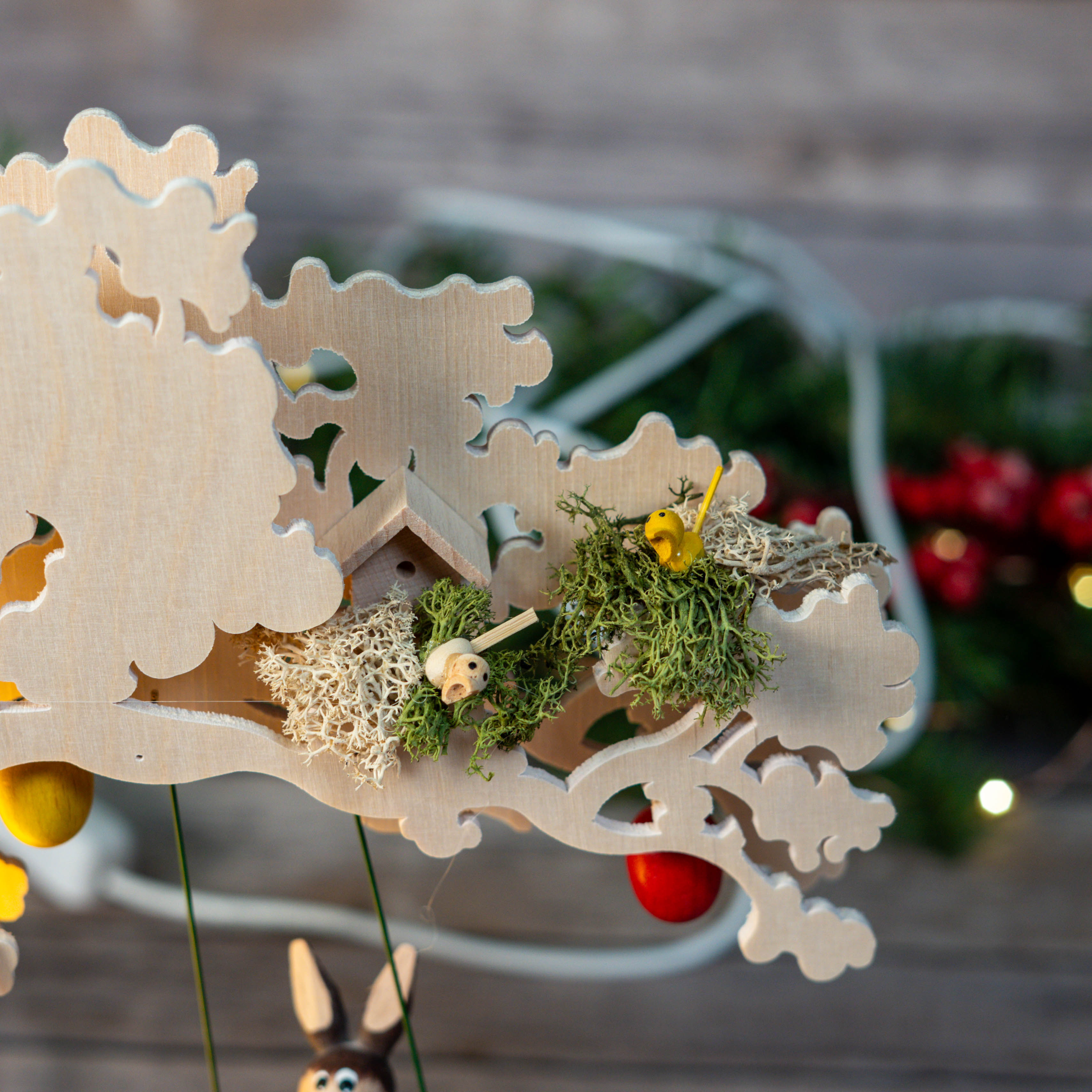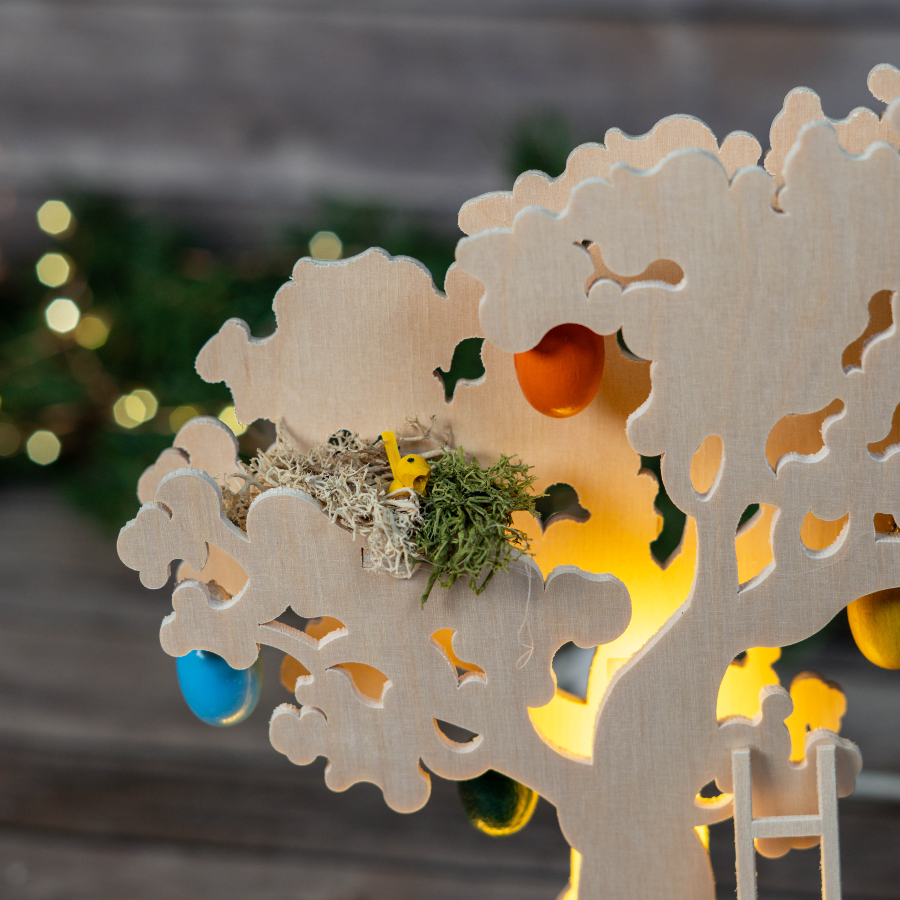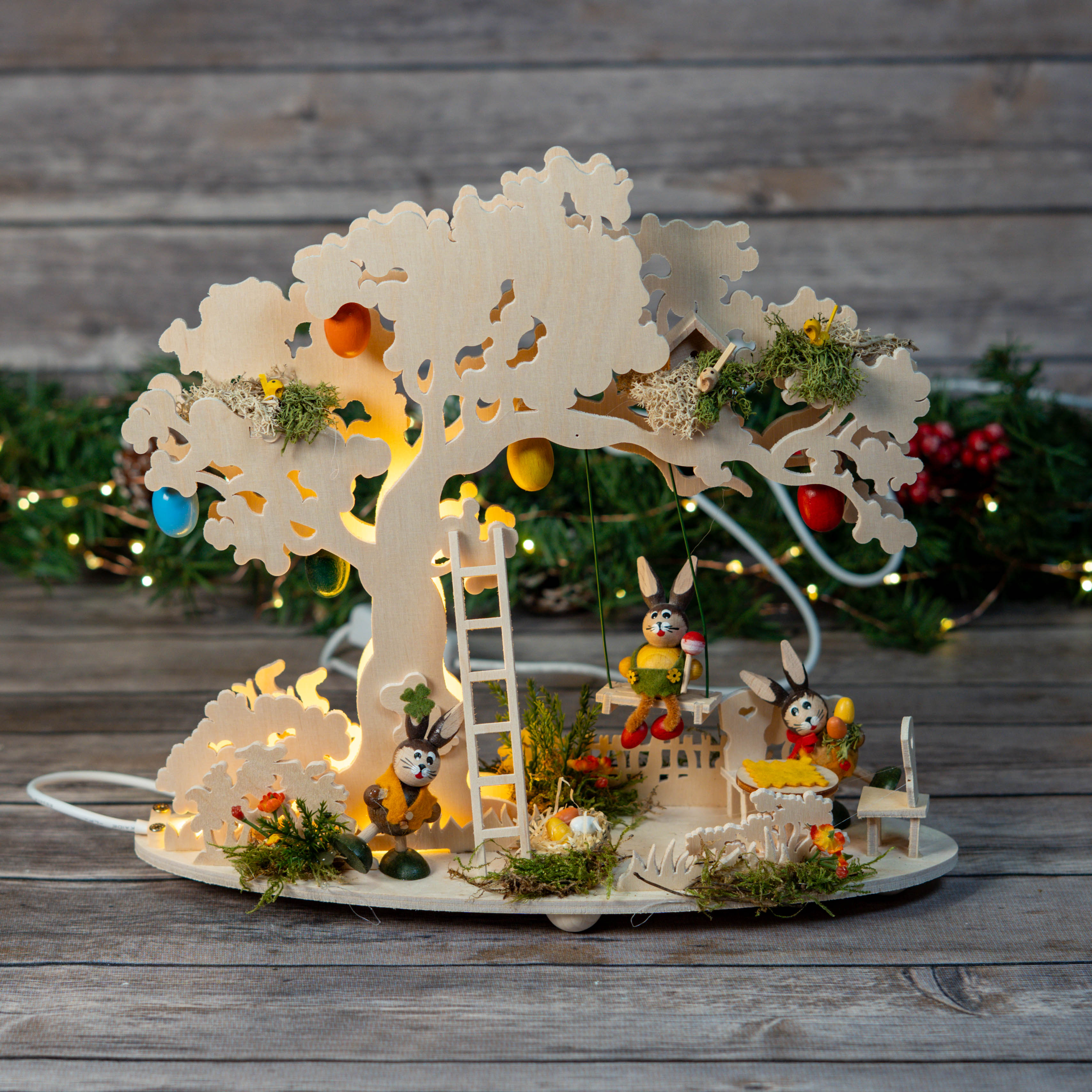 A beautiful Easter tree with LED lights in colorful balloons. A bunny swings while a wobbly bunny prepares a picnic at a seating area, and another is already busy hiding Easter eggs. Three bird's nests, Easter eggs, and floral Easter elements complete this Easter scene.
