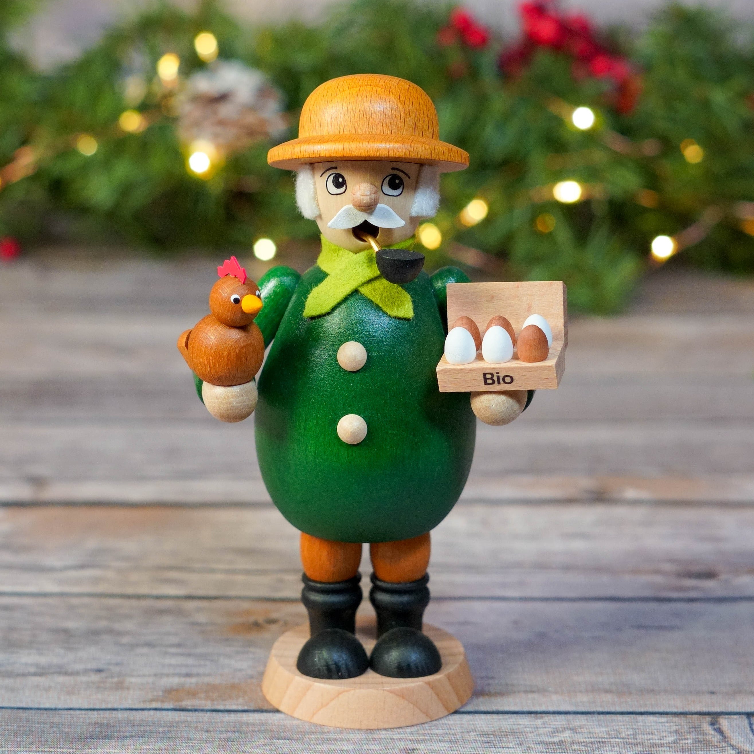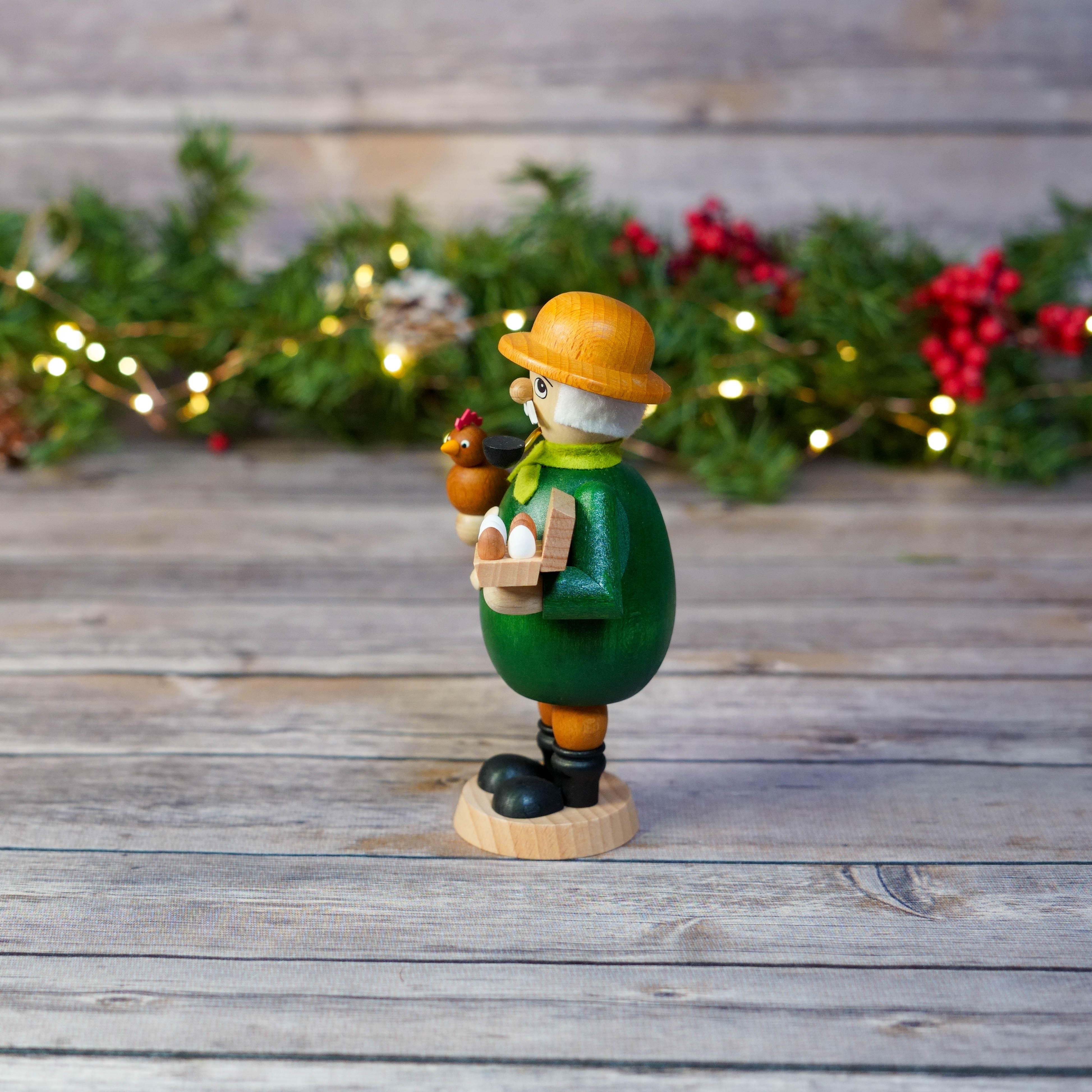 Discover the enchanting charm of our Handcrafted Farmer Smoker, a quintessential piece of traditional German Christmas decor. Standing 17 cm (6.7 inches) tall, this unique smoker is detailed with an egg basket and a tiny chicken, perfect for adding a rustic flair to your festive decorations.