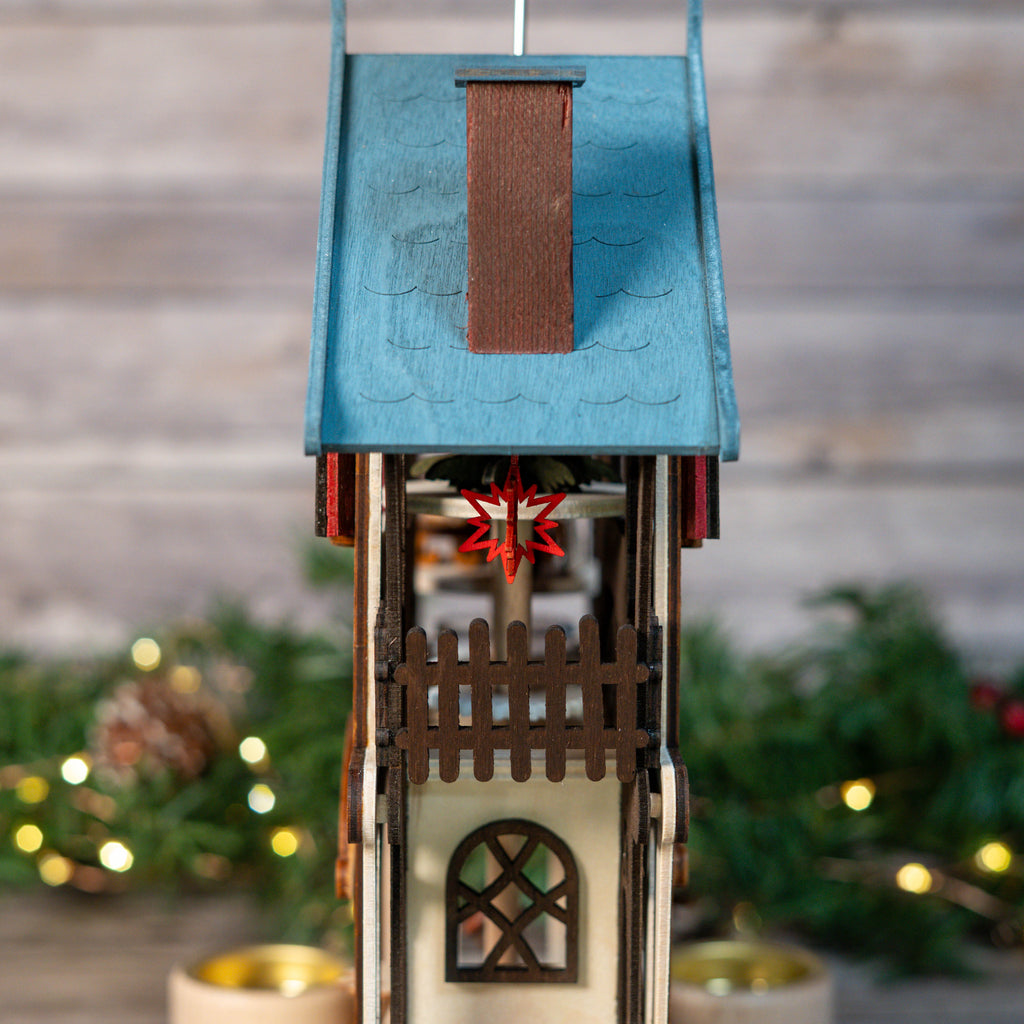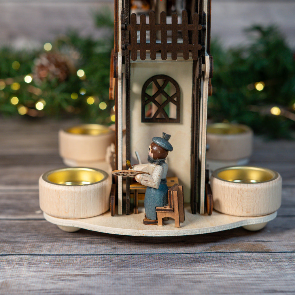 Designed with exquisite hand-carved details, this German Pyramid displays three angel figures and is powered by two tealight candles. The intricate 3-dimensional cathedral design features dark wood accents, adding a touch of elegance to any setting.
