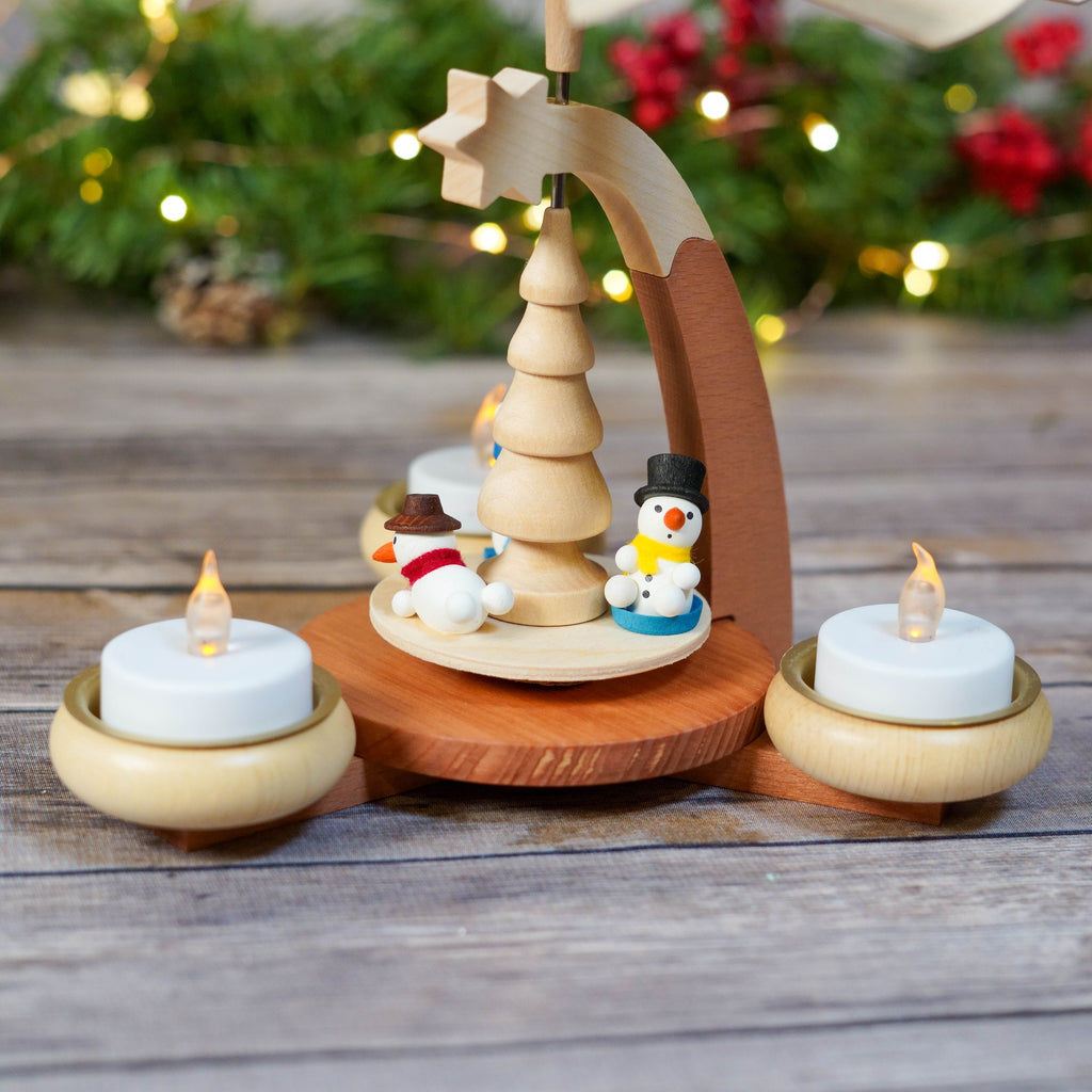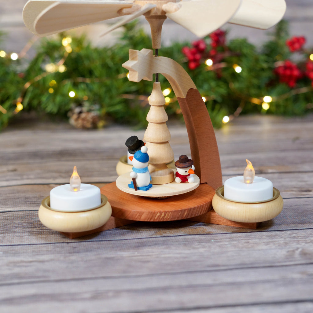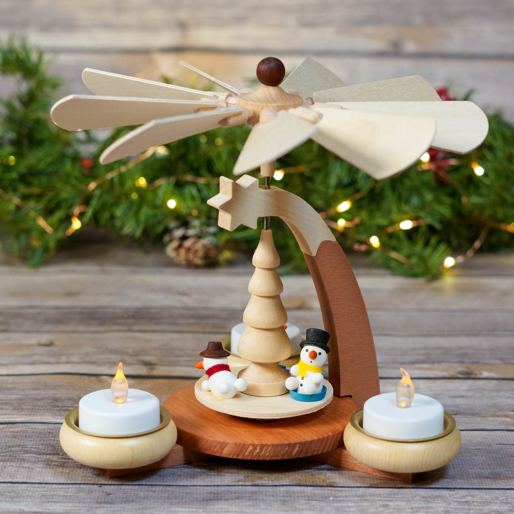 Invite a festive flurry of fun to your holiday with our Pyramid - This German Christmas Pyramid features a three playful snowmen that will cast a magical glow and bring a cheerful, endearing spirit to your décor. Light up your holiday season with this unique and delightful way to add a special sparkle to any room! Watch it spin when candles are lit and enjoy the snowmen playing from all angles.