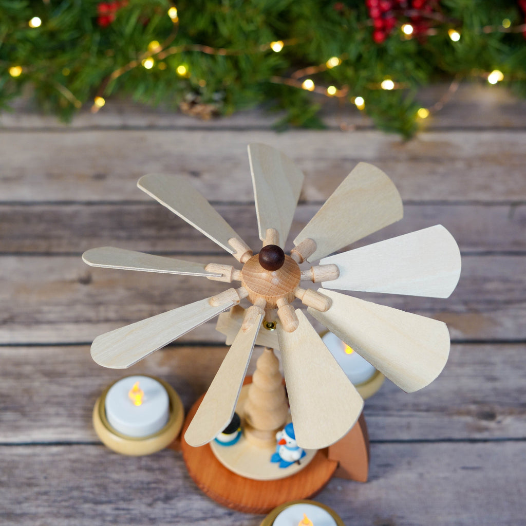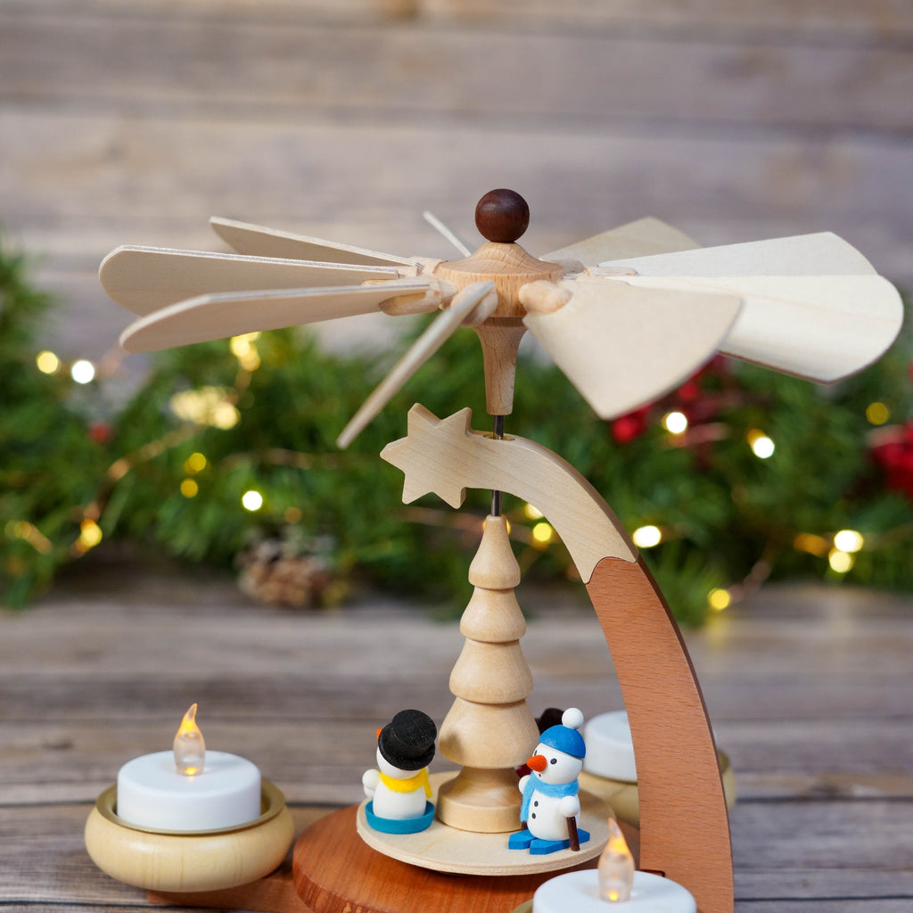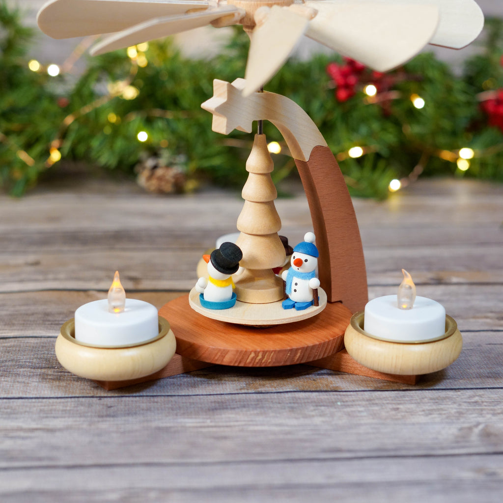 Invite a festive flurry of fun to your holiday with our Pyramid - This German Christmas Pyramid features a three playful snowmen that will cast a magical glow and bring a cheerful, endearing spirit to your décor. Light up your holiday season with this unique and delightful way to add a special sparkle to any room! Watch it spin when candles are lit and enjoy the snowmen playing from all angles.