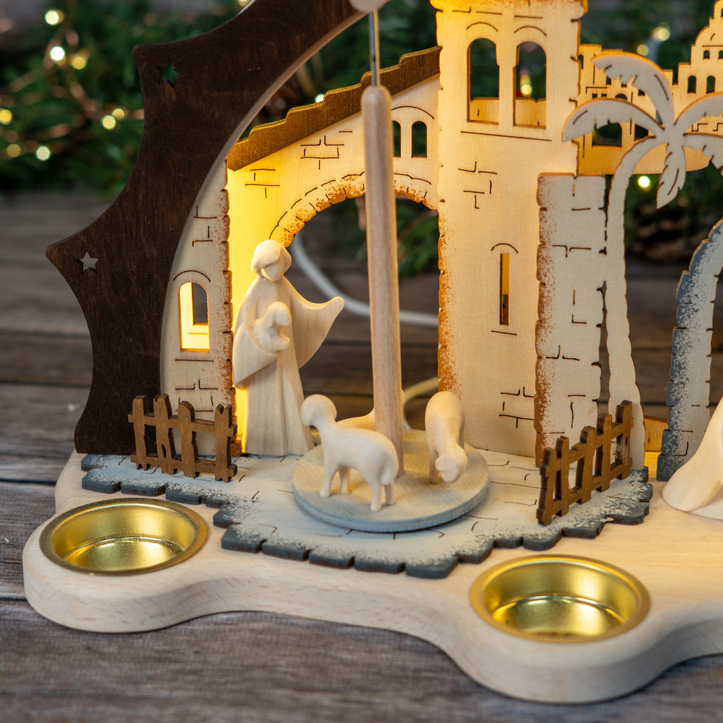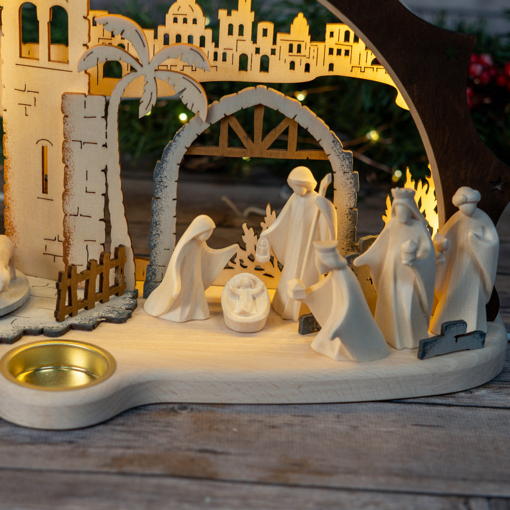 The birth scene of Christ in the stable at Bethlehem, depicted in an innovative RATAGS candle arch pyramid with genuine Tyrolean solid wood figures. A stained arch frames the scene against the distant backdrop of the city of Jerusalem. The pyramid, featuring a flock of sheep, is powered by two tea lights. The highlight: The arch is also equipped with indirect electric lighting, creating an atmospheric room atmosphere.
