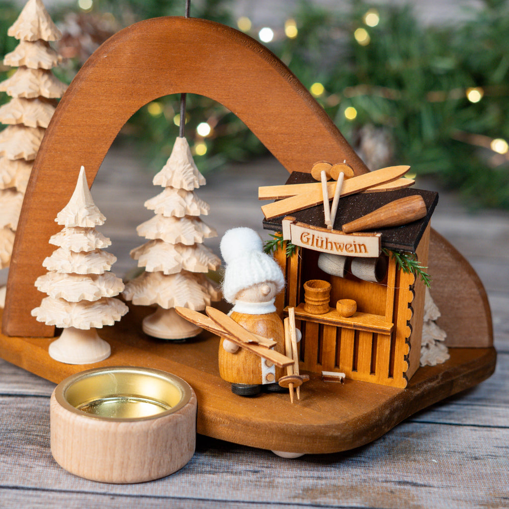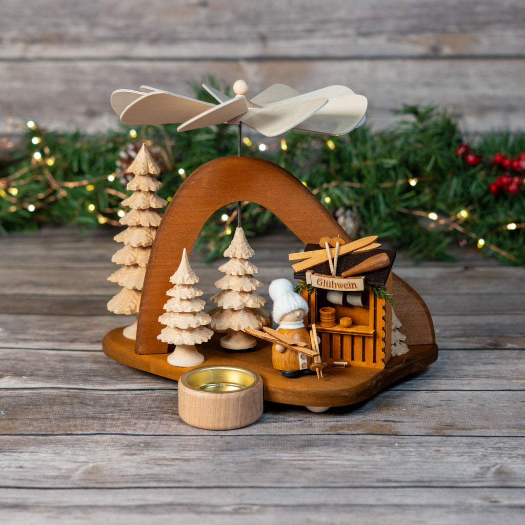 Our handmade wooden German Pyramids create a unique festive atmosphere adding the perfect holiday touch to your collection. When the candles are lit, the tiers slowly begin to turn creating an enchanting play of light and shadow throughout the room. Sometimes referred to as a Christmas Carousel, German Windmill or a Candle Carousel.