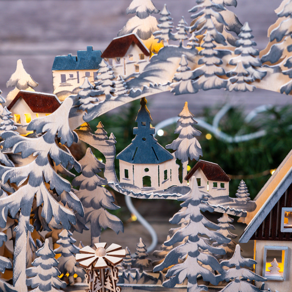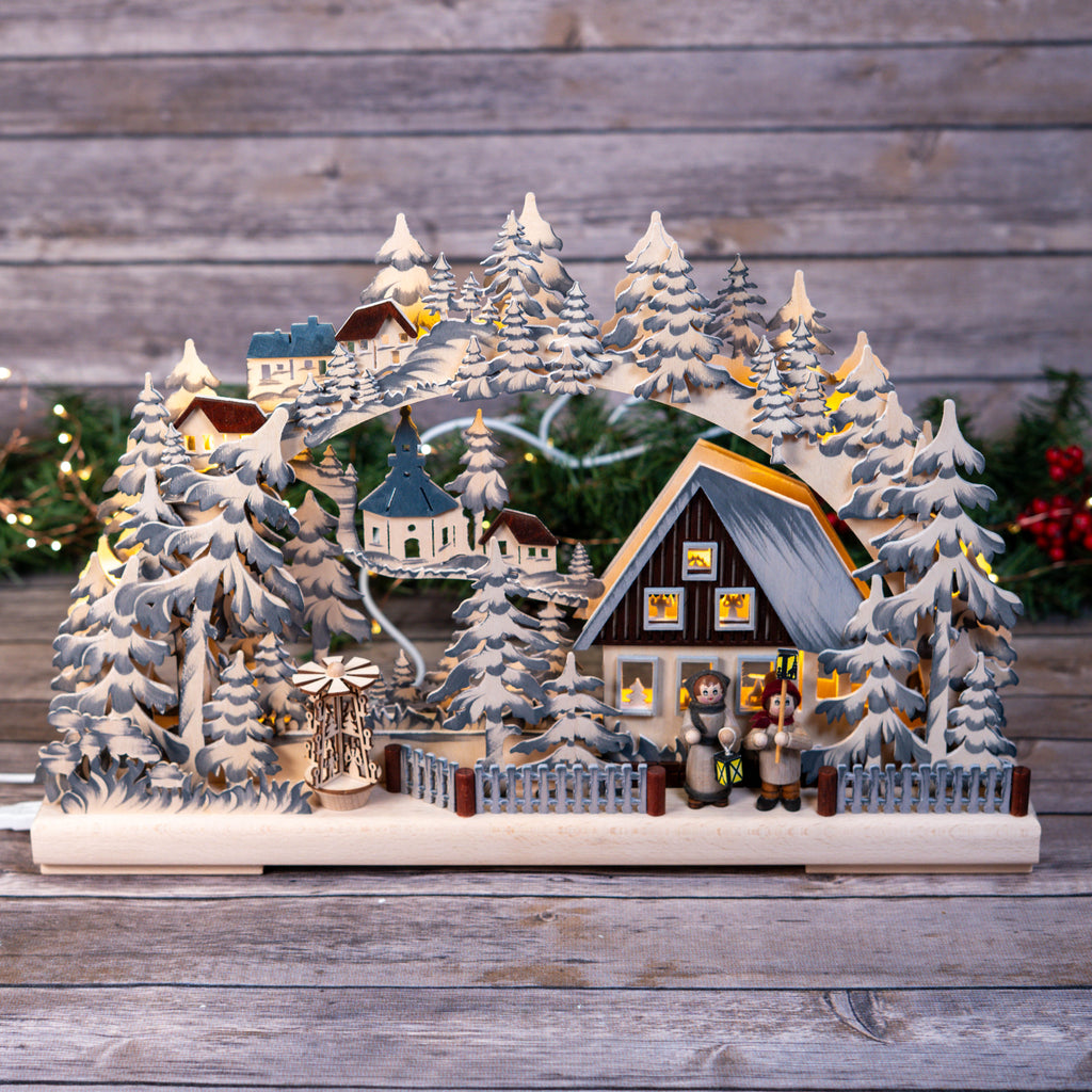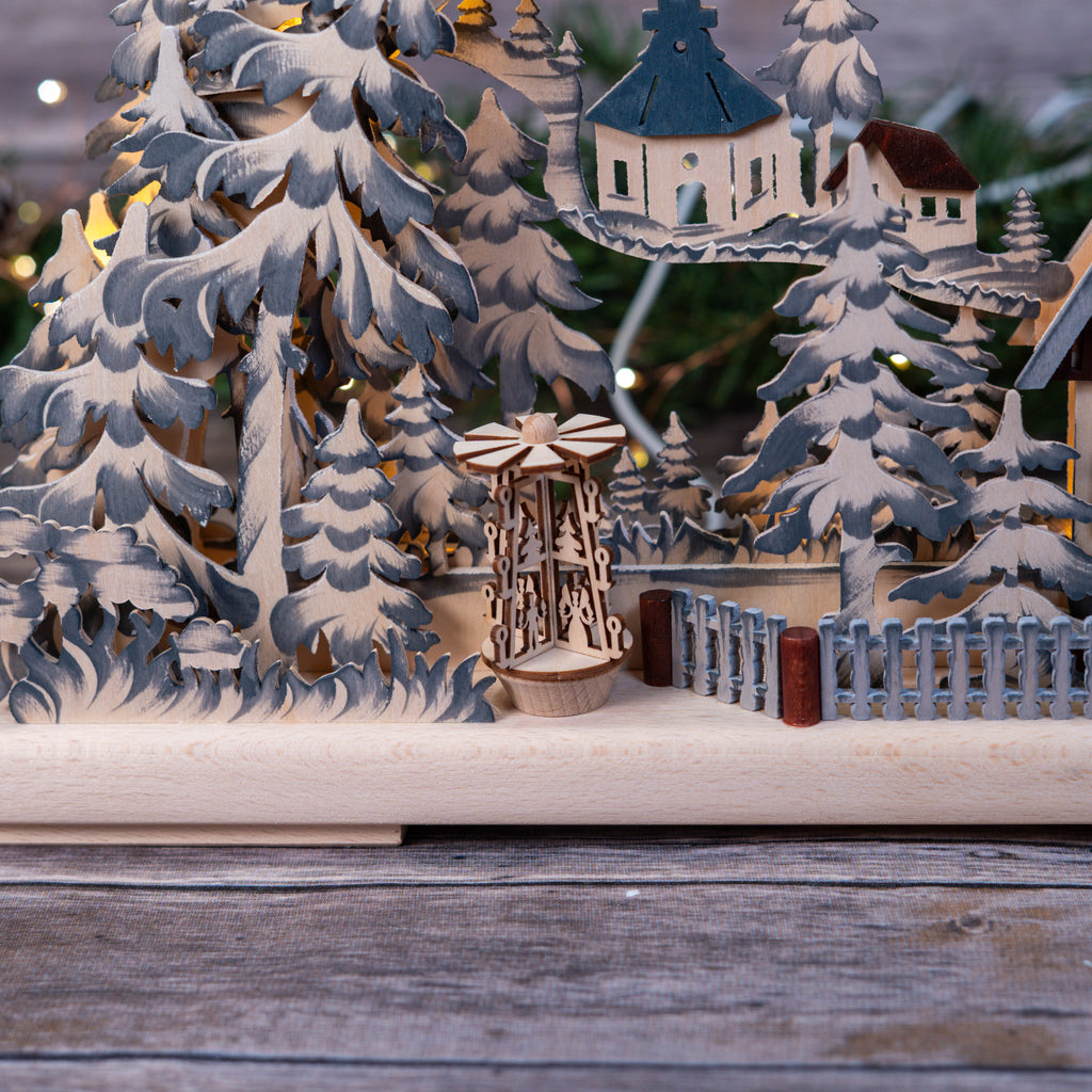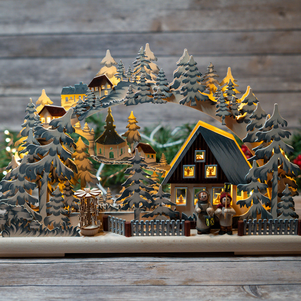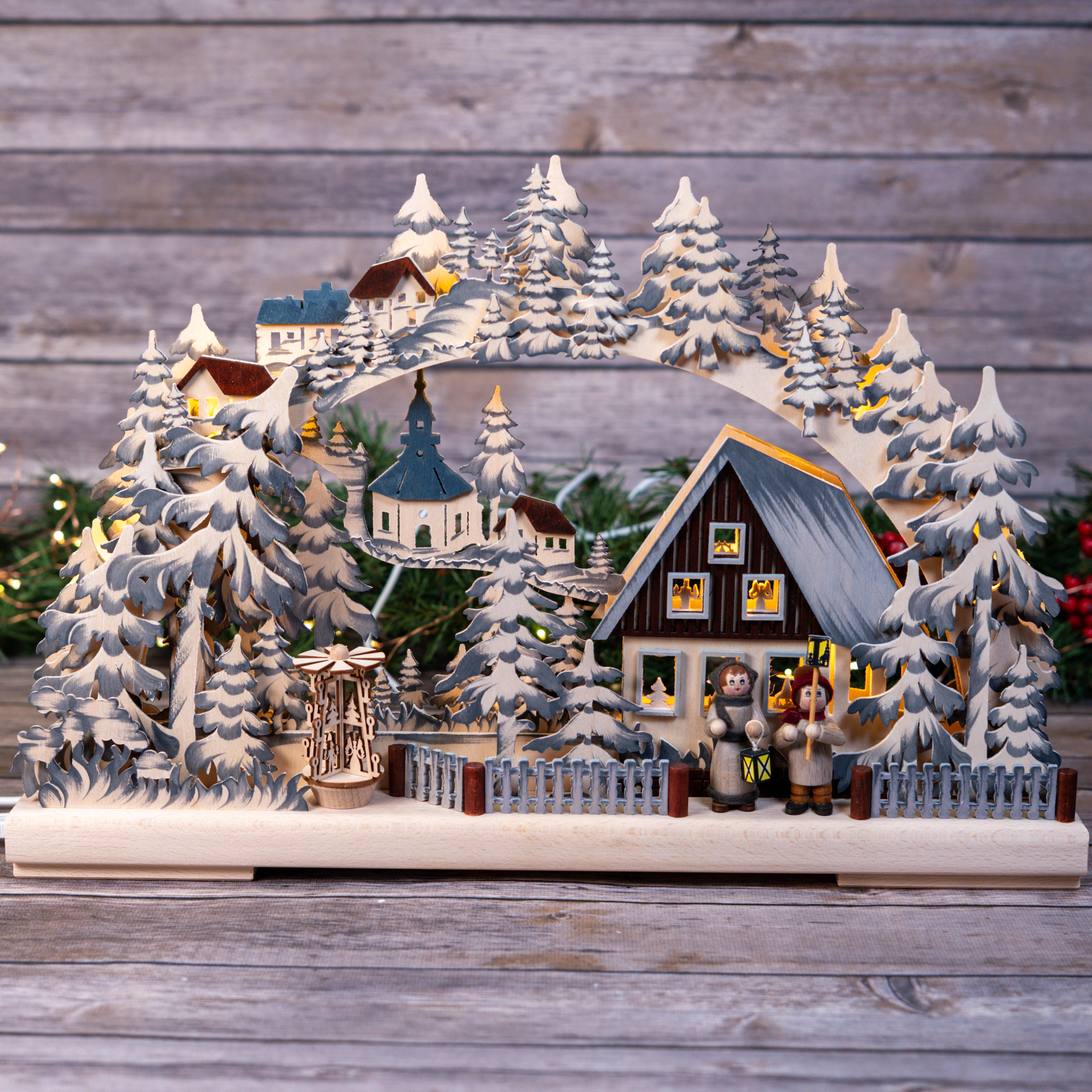 Lanterns are a must-have for the toy village of Seiffen. These are proudly carried by two RATAGS children's figures in the Erzgebirge-style 3D candle arch. Tiny Christmas decorations hang in the windows of the half-timbered house. The roofs in the background, the half-timbered house, and the fence are stained in color. A small pyramid completes the traditional fretwork made of birch plywood. A string of LED lights provides cozy illumination. This version of the candle arch is hand-shaded in gray