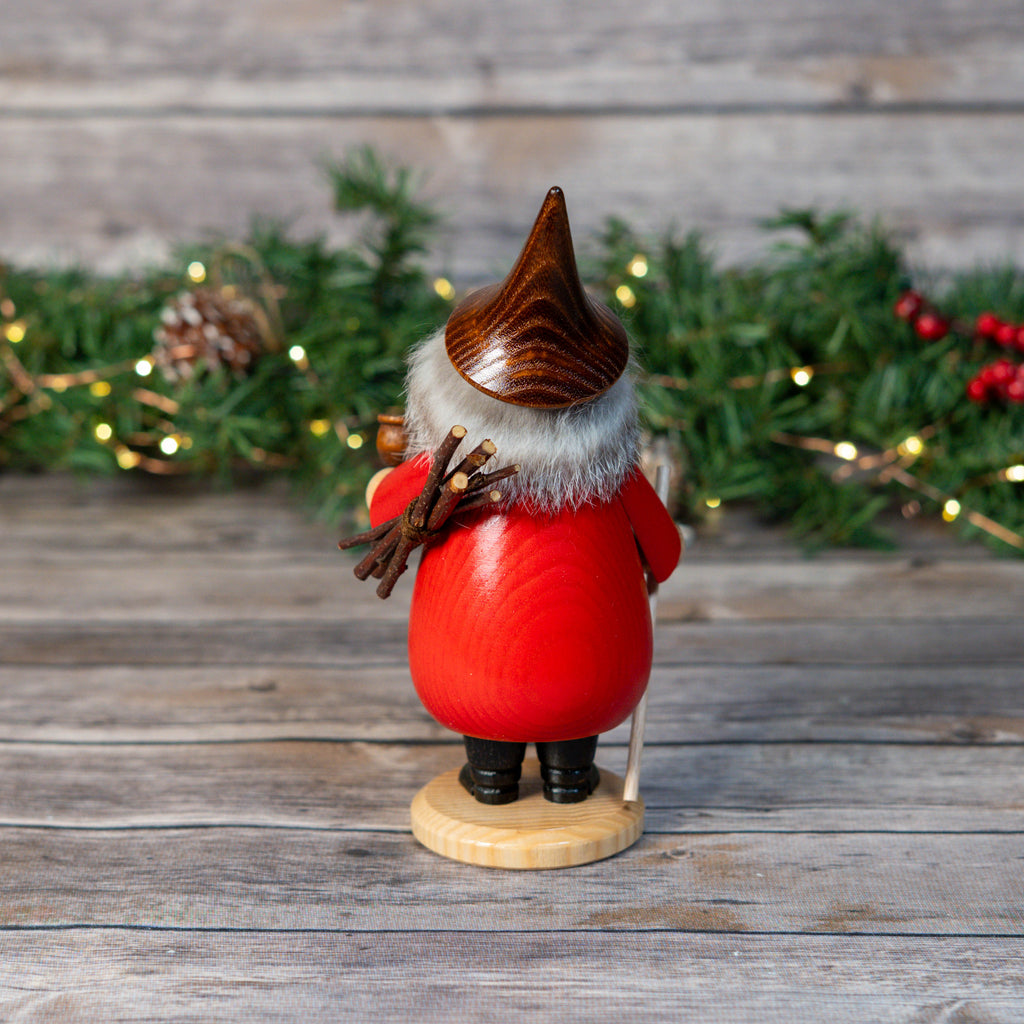 Introducing our Handcrafted Squat Wood Gatherer Smoker from the renowned Erzgebirge region in Germany. This traditional smoking man exudes rustic charm with natural wood tones and a vibrant red polka-dot hat, enhancing the festive spirit of your home.