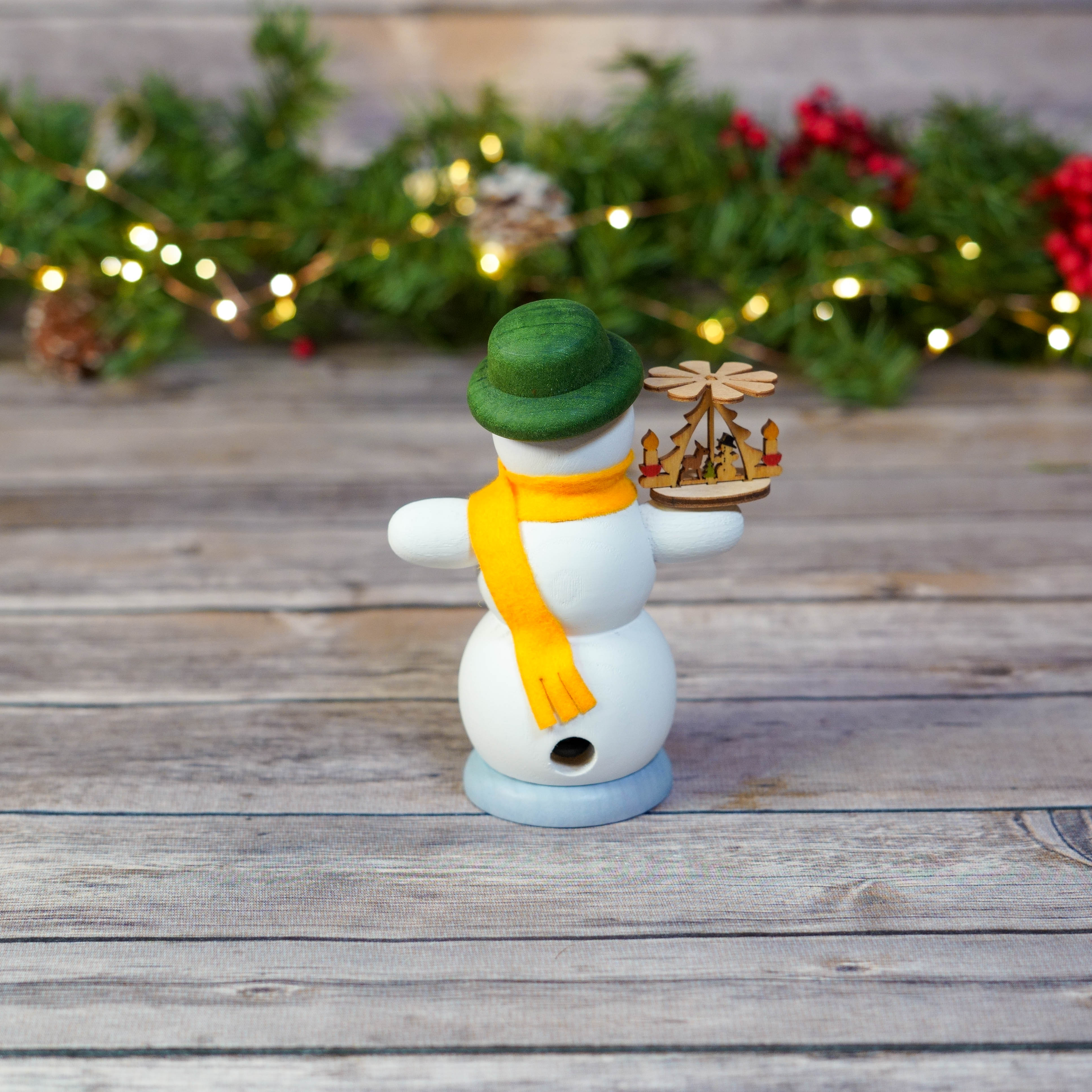 Delight in the charm of our Traditional German Snowman with Pyramid. This festive and intricately crafted piece stands at 25 cm (9.8 inches), perfectly sized for any holiday tableau. It combines the joyous spirit of a snowman with the classic allure of a German Christmas pyramid, making it an ideal addition to your seasonal decorations.