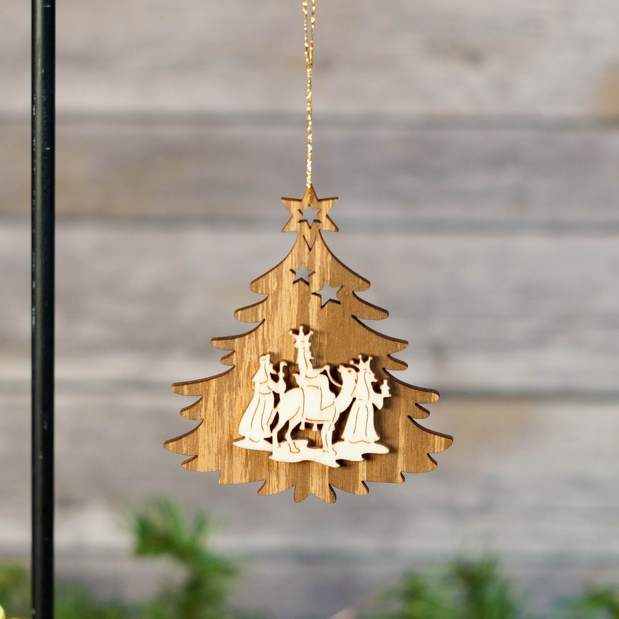 Add a classic touch to your holiday decor with this Three Wisemen Christmas Ornament. Crafted with precision, the light wood figures of the Three Wisemen journey towards a beautifully stained star backdrop, perfect for any festive setting.