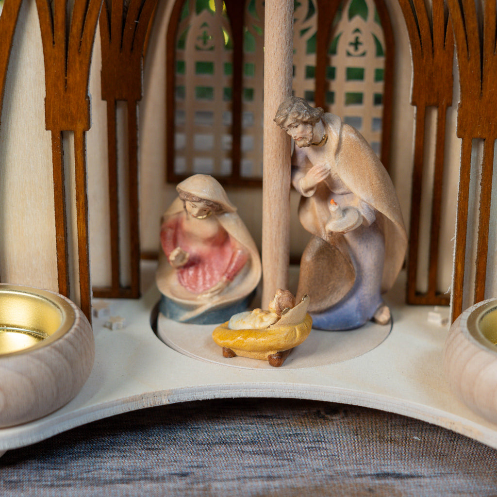 Beautiful cathedral pyramid with the Holy Family. The figures were colorfully designed.